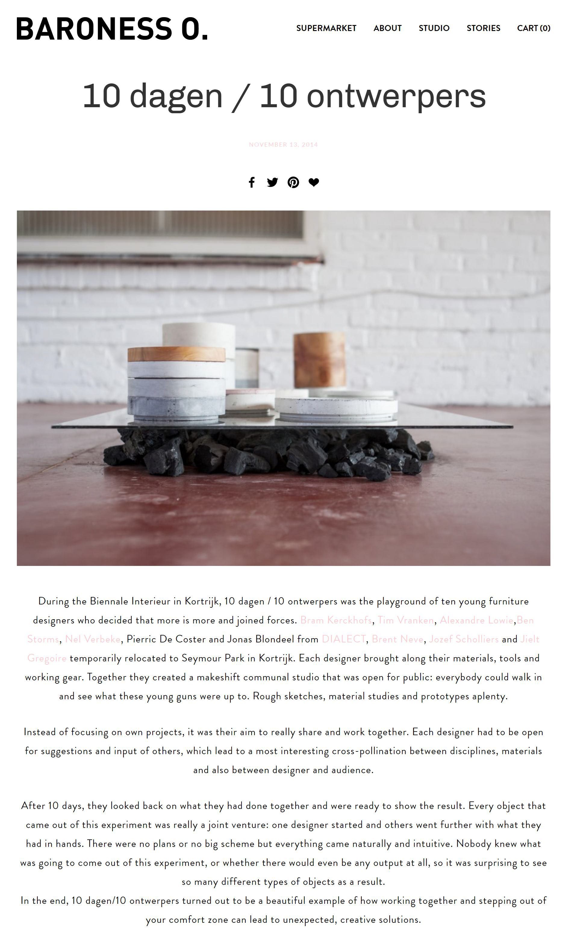 During the Biennale Interieur in Kortrijk, 10 dagen / 10 ontwerpers was the playground of ten young furniture designers who decided that more is more and joined forces. Bram Kerckhofs, Tim Vranken, Alexandre Lowie,Ben Storms, Nel Verbeke, Pierric De Coster and Jonas Blondeel from DIALECT, Brent Neve, Jozef Scholliers and Jielt Gregoire temporarily relocated to Seymour Park in Kortrijk. Each designer brought along their materials, tools and working gear. Together they created a makeshift communal studio that was open for public: everybody could walk in and see what these young guns were up to. Rough sketches, material studies and prototypes aplenty. Instead of focusing on own projects, it was their aim to really share and work together. Each designer had to be open for suggestions and input of others, which lead to a most interesting cross-pollination between disciplines, materials and also between designer and audience. After 10 days, they looked back on what they had done together and were ready to show the result. Every object that came out of this experiment was really a joint venture: one designer started and others went further with what they had in hands. There were no plans or no big scheme but everything came naturally and intuitive. Nobody knew what was going to come out of this experiment, or whether there would even be any output at all, so it was surprising to see so many different types of objects as a result. In the end, 10 dagen/10 ontwerpers turned out to be a beautiful example of how working together and stepping out of your comfort zone can lead to unexpected, creative solutions. https://www.baronesso.com/home/2017/1/10-dagen-10-ontwerpers?rq
