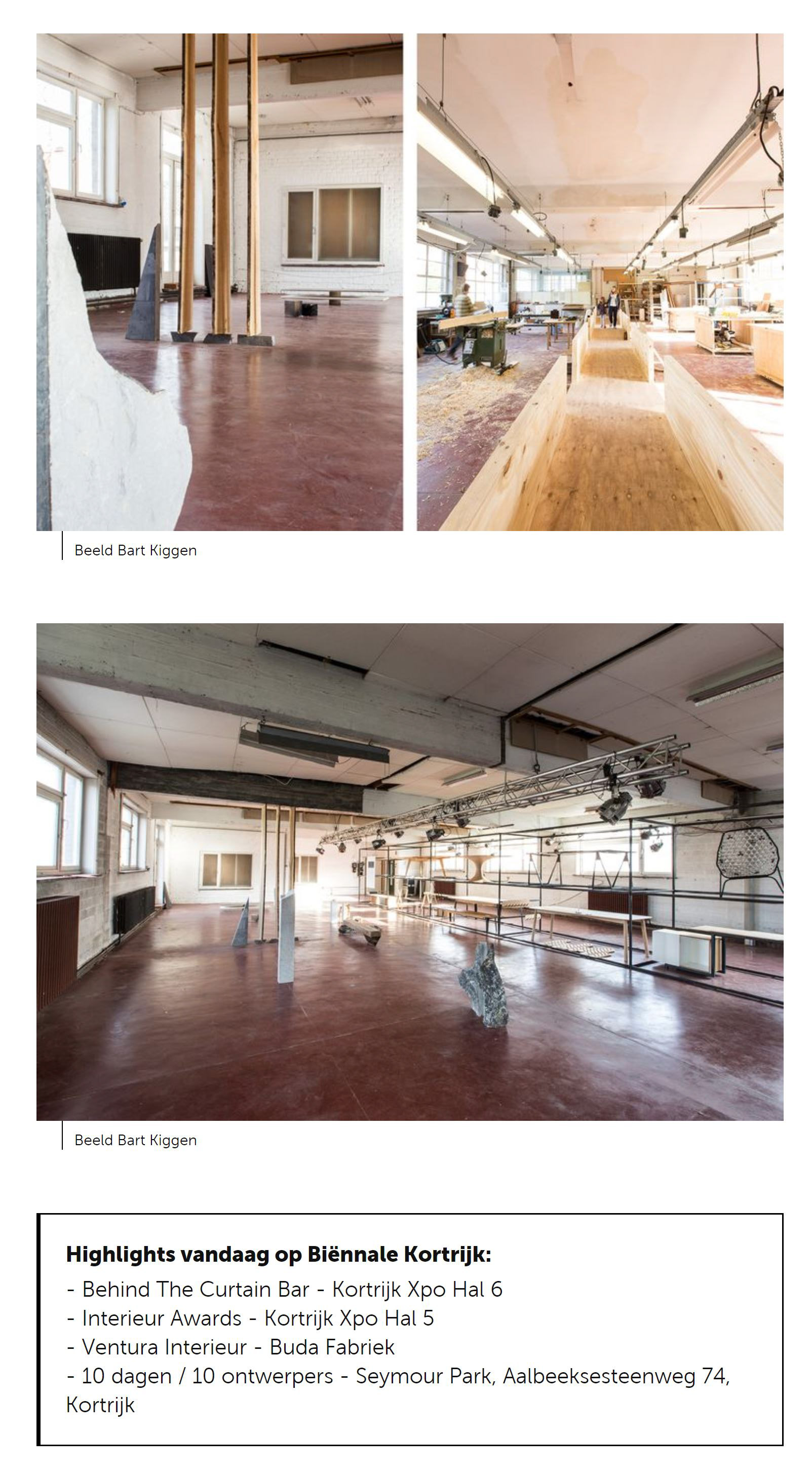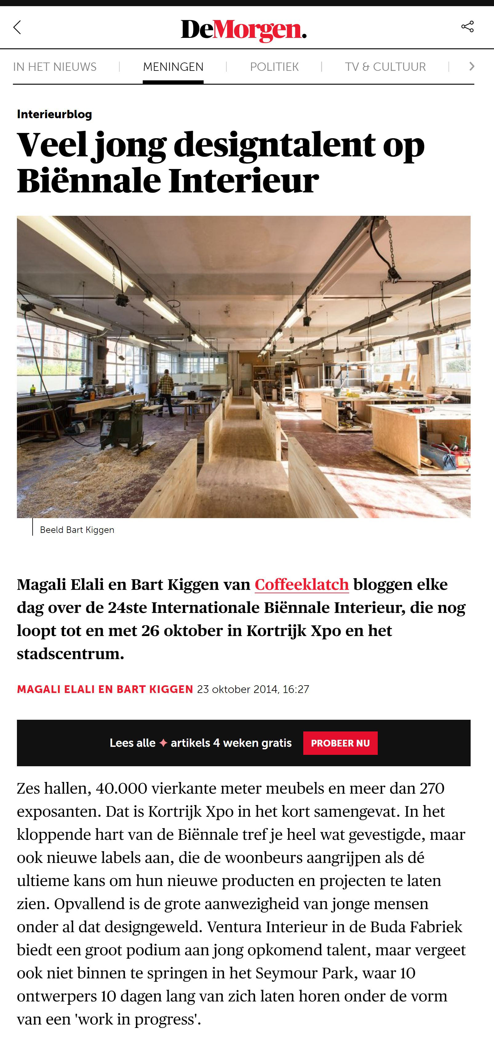 Magali Elali en Bart Kiggen van Coffeeklatch bloggen elke dag over de 24ste Internationale Biennale Interieur, die nog loopt tot en met 26 oktober in Kortrijk Xpo en bet stadscentrum Zes hallen, 40.000 vierkante meter meubels en meer dan 270 exposanten. Dat is Kortrijk Xpo in het kort samengevat. In het kloppende hart van de Biennale tref je heel wat gevestigde, maar ook nieuwe labels aan, die de woonbeurs aangrijpen als de ultieme kans om hun nieuwe producten en projecten te laten zien. Opvallend is de grote aanwezigheid van jonge mensen onder al dat designgeweld. Ventura Interieur in de Buda Fabriek biedt een groot podium aan jong opkomend talent, maar vergeet ook niet binnen te springen in het Seymour Park, waar 10 ontwerpers 10 dagen lang van zich laten horen onder de vorm van een 'work in progress'. 10 DAGEN / 10 ONTWERPERS Het meest verfrissende tentoonstellingsconcept van de Biennale vinden we echter terug in het Interieur Extra-programma, en meer bepaald in het Seymour Park in Kortrijk, waar tien jonge meubelontwerpers tien dagen lang een open atelier delen. Geen traditionele showroom met meubels en foto's, maar een levende workshop met hout-, stoffeer- en staalatelier beneden en een archief en tentoonstelling boven in een indrukwekkend industrieel pand, waar vroeger kepies voor politieagenten werden geproduceerd. '10 dagen / 10 ontwerpers' is een work in progress, maar ook een mooi voorbeeld van interactie en kruisbestuiving tussen jonge ontwerpers. Jonas Blondeel van Dialect vertelt: "We doen hier dingen die we normaal gezien nooit in ons eigen atelier zouden doen. We moeten hier immers niet werken aan een afgewerkt product, maar we krijgen nu de tijd om materialen, zoals hout, metaal, marmer en leder met elkaar te combineren en daar verschillende technieken op toe te passen." De resultaten zijn verrassend. Je kunt ze bekijken op de bovenverdieping, waar hun 'Tempel tot Verhouding' dagelijks aangroeit met nieuwe experimenten. Daarna kun je alles doorspoelen met drank en muziek in de muzikale kelder, waar de ontwerpers tot in de vroege uurtjes doorgaan. Bij de tien ontwerpers vind je onder anderen conceptuele denker Nel Verbeke, meubelmakers Alexandre Lowie en Ben Storms (wiens werk je ook kunt bewonderen op 'Ventura Interieur' in de Buda Fabriek), Brent Neve, Bram Kerckhofs, designer Tim Vrancken, multidisciplinair ontwerper Jielt Gregoire, stoffeerder Jozef Scholliers en Jonas Blond eel en Pierrie De Coster van Dialect.