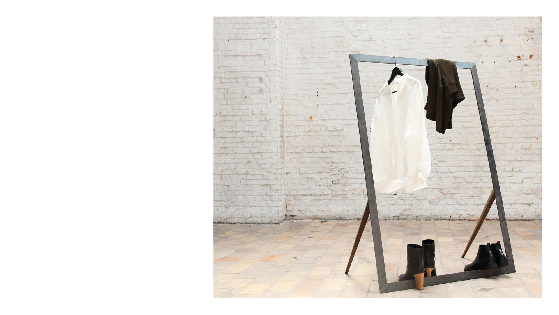 The object “Kleerstaander” with it's blue steel frame, frames the garments. This gives the design both a practical as aesthetic function. The frame is held by removable oak legs. The dimensions are based on the standard dimensions of steel plates to generate as little loss as possible, without sacrificing functionality.